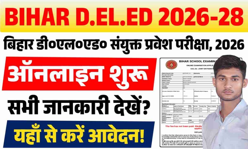 Bihar D.El.Ed Entrance Exam Form 2026 : बिहार विद्यालय परीक्षा समिति द्वारा प्रारंभिक शिक्षा में डिप्लोमा (डी०एल०एड०) पाठयक्रम के सत्र 2026-28 में नामांकन हेतु डी०एल०एड० संयुक्त प्रवेश परीक्षा, 2026 के लिए ऑनलाइन आवेदन पत्र आमंत्रित किया है। ऑनलाइन आवेदन पत्र भरने की शुरुआत तिथि 11.12.2025 एवं ऑनलाइन आवेदन पत्र भरने की अंतिम तिथि (परीक्षा शुल्क के साथ) 24.01.2026 तक निर्धारित हैं। परीक्षा की तिथि जल्द जारी किया जाएगा। उम्मीदवार आधिकारिक बेवसाइट bsebdeled.com पर जाकर आवेदन कर सकते हैं।
