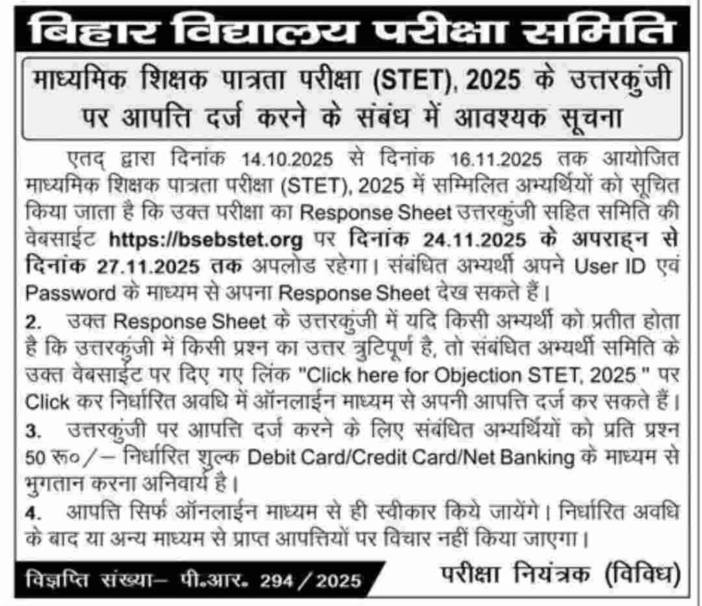 एतद् द्वारा दिनांक 14.10.2025 से दिनांक 16.11.2025 तक आयोजित माध्यमिक शिक्षक पात्रता परीक्षा (STET), 2025 में सम्मिलित अभ्यर्थियों को सूचित किया जाता है कि उक्त परीक्षा का Response Sheet उत्तरकुंजी सहित समिति की वेबसाईट bsebstet.org पर दिनांक 24.11.2025 के अपराह्न से दिनांक 27.11.2025 तक अपलोड रहेगा। संबंधित अभ्यर्थी अपने User ID एवं Password के माध्यम से अपना Response Sheet देख सकते हैं।